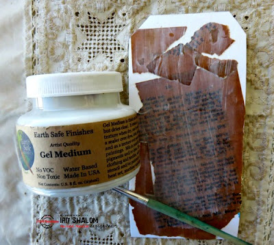 1. Glue a very antique piece of a book page to the big tag with Gel Medium. I used ESF one, but any medium is good for this step.